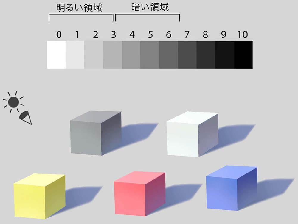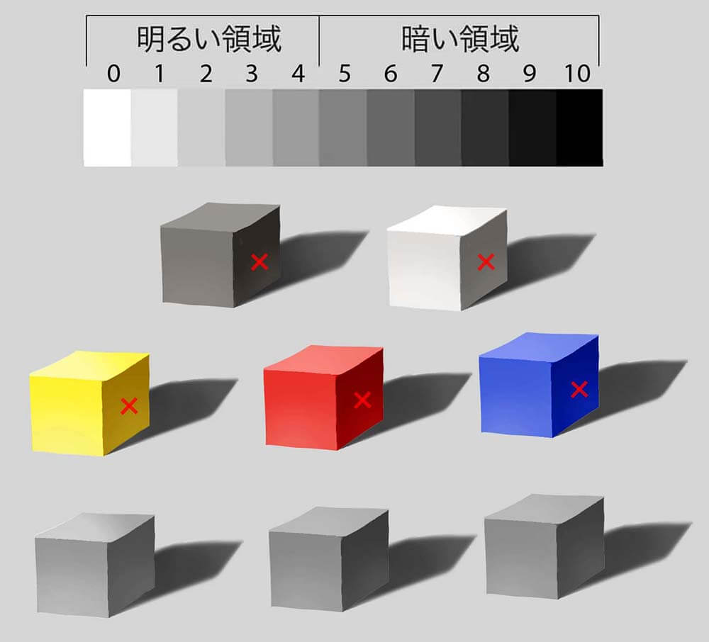 각 박스의 붉은 색의 ×표를 붙인 면은, 모두 그늘이 되어 있는 부분입니다. 여기서의 규칙은 5~10의 범위내가 어두운 영역(음영)이므로, ×표의 밸류는 반드시 이 영역이 아니면 안됩니다.