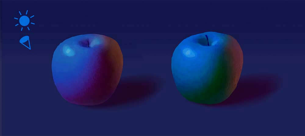 ▲ 인공빛에 비추어진 빨강과 파랑 사과를 페인트하고 있습니다. 여기에서는, 화면을 향해 좌측으로부터 푸르고 강한 빛이 메인의 광원으로서 맞고 있는 설정으로 했습니다. 또, 화면을 향해 우측으로부터는, 핑크색의 빛이 세컨드 라이트로서 닿고 있습니다. 인공의 강한 색의 빛이 닿으면 모티브의 색도 바뀝니다.