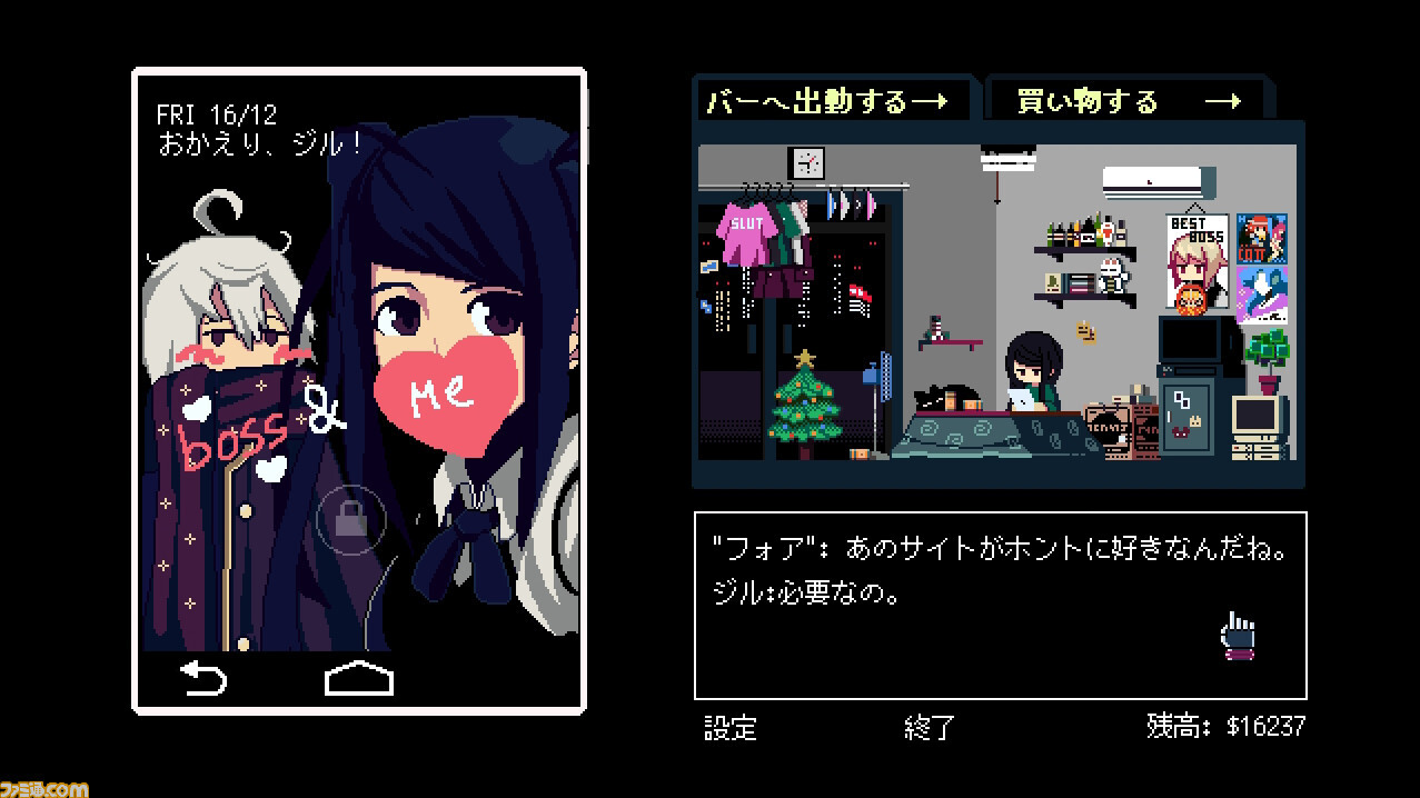 『VA-11 Hall-A』. 화면 오른쪽의 난로 위에 둥글게 되어 있다.