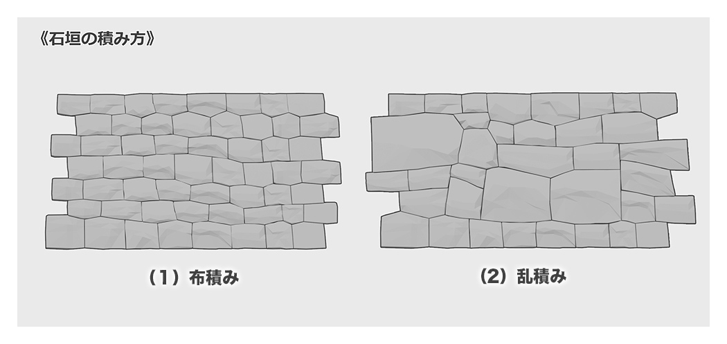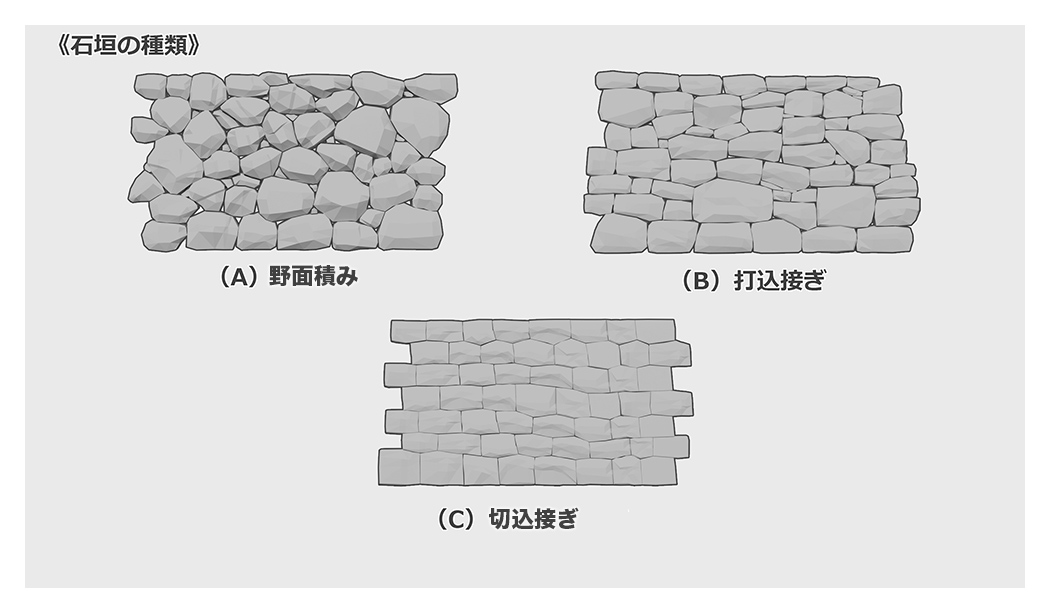 이와 같이 이시가키는, 돌의 가공으로 3종류, 쌓는 방법으로 2종류의 조합으로 총 6종류로 분류됩니다.