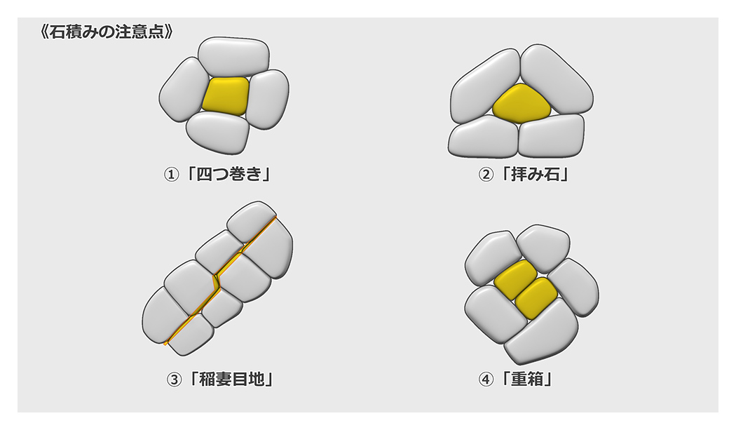 같은 돌을 2개 쌓은 적재 방법. 돌이 빠지기 쉬워집니다. 3개 겹쳐진 쌓는 방법을 「이모꼬치」라고 합니다.