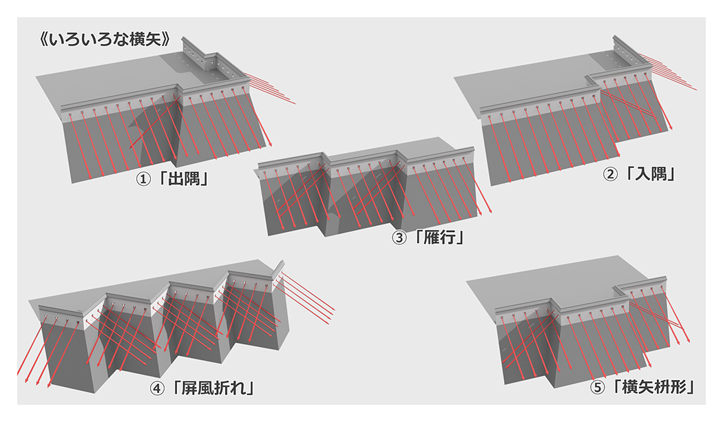 에도성이나 오사카성 등의 성벽을 보면, 곳곳에 직각으로 구부러져 있습니다. 안으로 들어가도 길과 계단은 똑바르지 않고 직각으로 구부러져 있습니다. 이러한 꺾은 성벽을 「요코야」 또는 「요코야카카리」라고 부릅니다. 적이 공격해 왔을 때, 정면에서가 아니라 옆에서도 활이나 철포로 공격(요코야) 하기 때문입니다. 대표적인 요코야의 구조를 아래에 도해합니다.