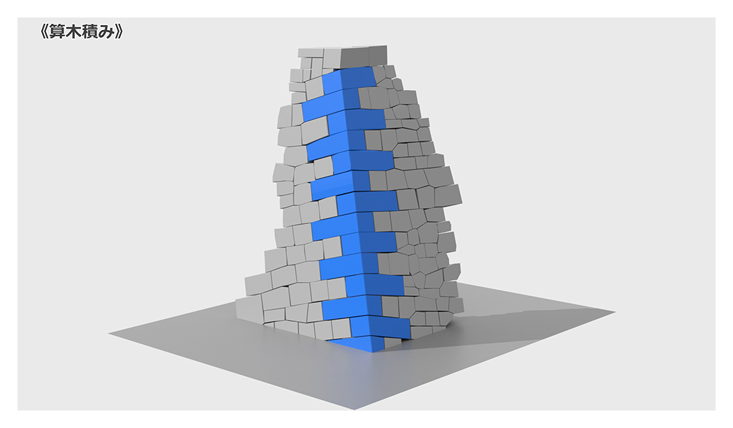 「산목 쌓기(산기즈미)」는 이시가키의 모퉁이에 보이는 쌓는 방법으로, 횡장의 직방체를 교대로 쌓아 갑니다. 이것에 의해, 이시가키 전체의 강도가 오르는 것 같습니다.