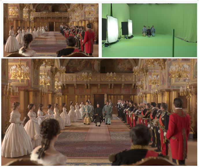 도쿠가와 아키타케(이타가키 리 광인)의 나폴레옹 3세에의 접견 장면은, 현지에서 촬영한 배경에 일본에서 촬영한 인물을 합성했다. 인물의 보폭을 미리 산출하고 파리에 보내 적절한 길이로 소스를 촬영했다.