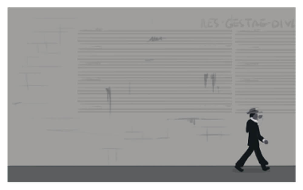 ▲『The Conformist(방제:암살의 숲)』(1970)(베르나르도 베르토루치(Bernardo Bertolucci) 감독) 안의 샷을 필자가 인용 목적으로 모사한 것입니다. 캐스트 섀도우가 없는 백색 벽과는 대조적으로, 오른쪽 하단의 인물은 어두운 색으로 표현되어, 디자인성이 높은 화면이 되어 있습니다