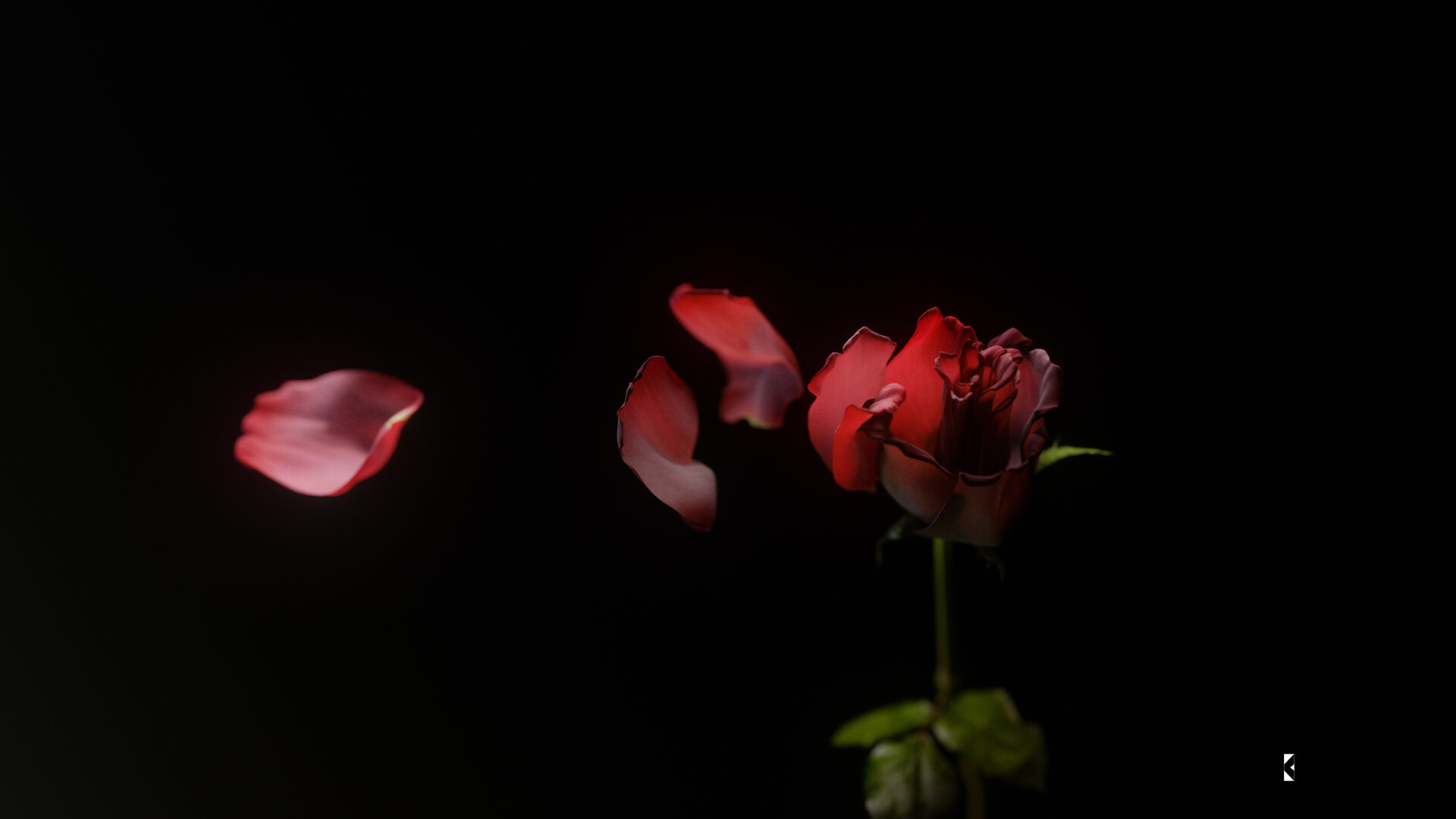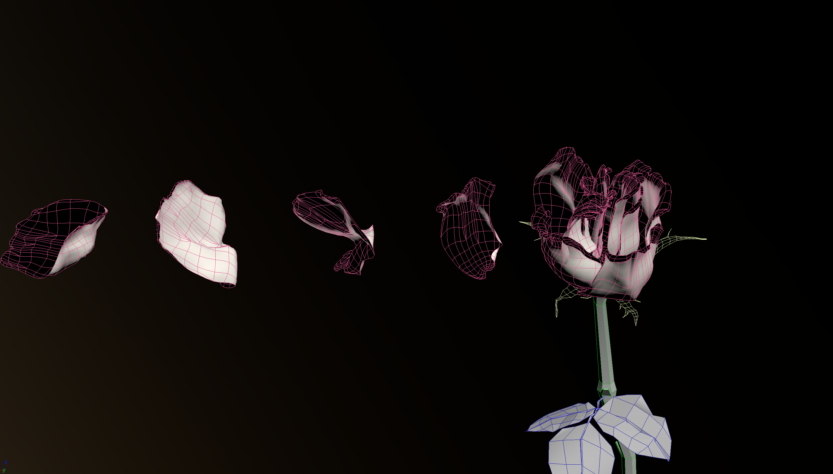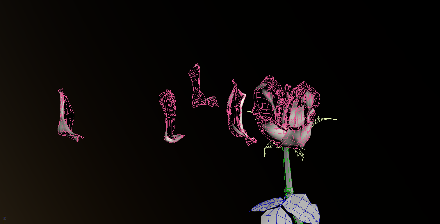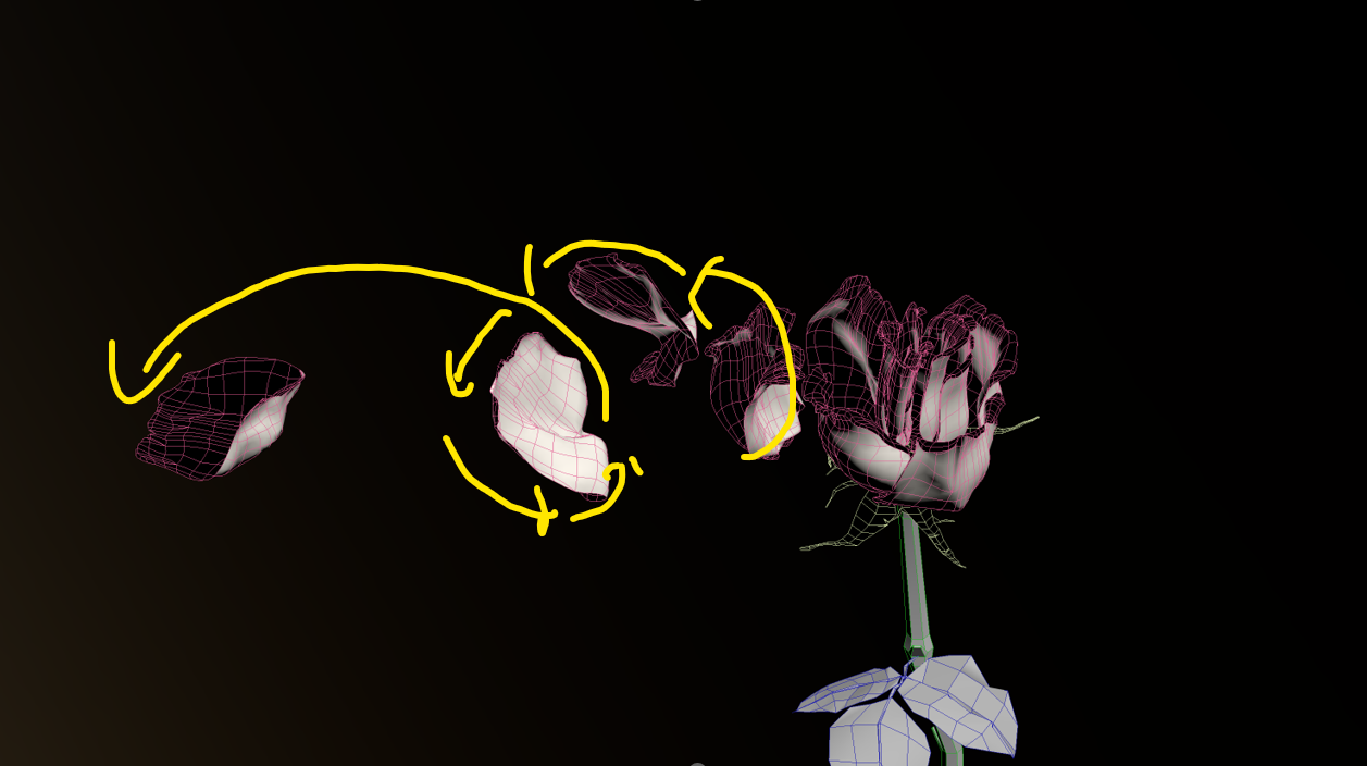 움직임을 표현하기 위해, 예를 들어 "오른쪽에서 바람이 불고 있다"고 가정하면 바람은 장미의 부드러운 바깥 꽃잎에서 한 장씩 날아갑니다. 1장 1장의 거리를 조정하는 것으로, 무너져 풀려 흩어지도록 날아 간다……라고 하는 인상을 줄 수 있습니다. 회전시키는데도, 단지 회전할 뿐만 아니라 「연속의 흐름」을 의식하면 좋습니다.