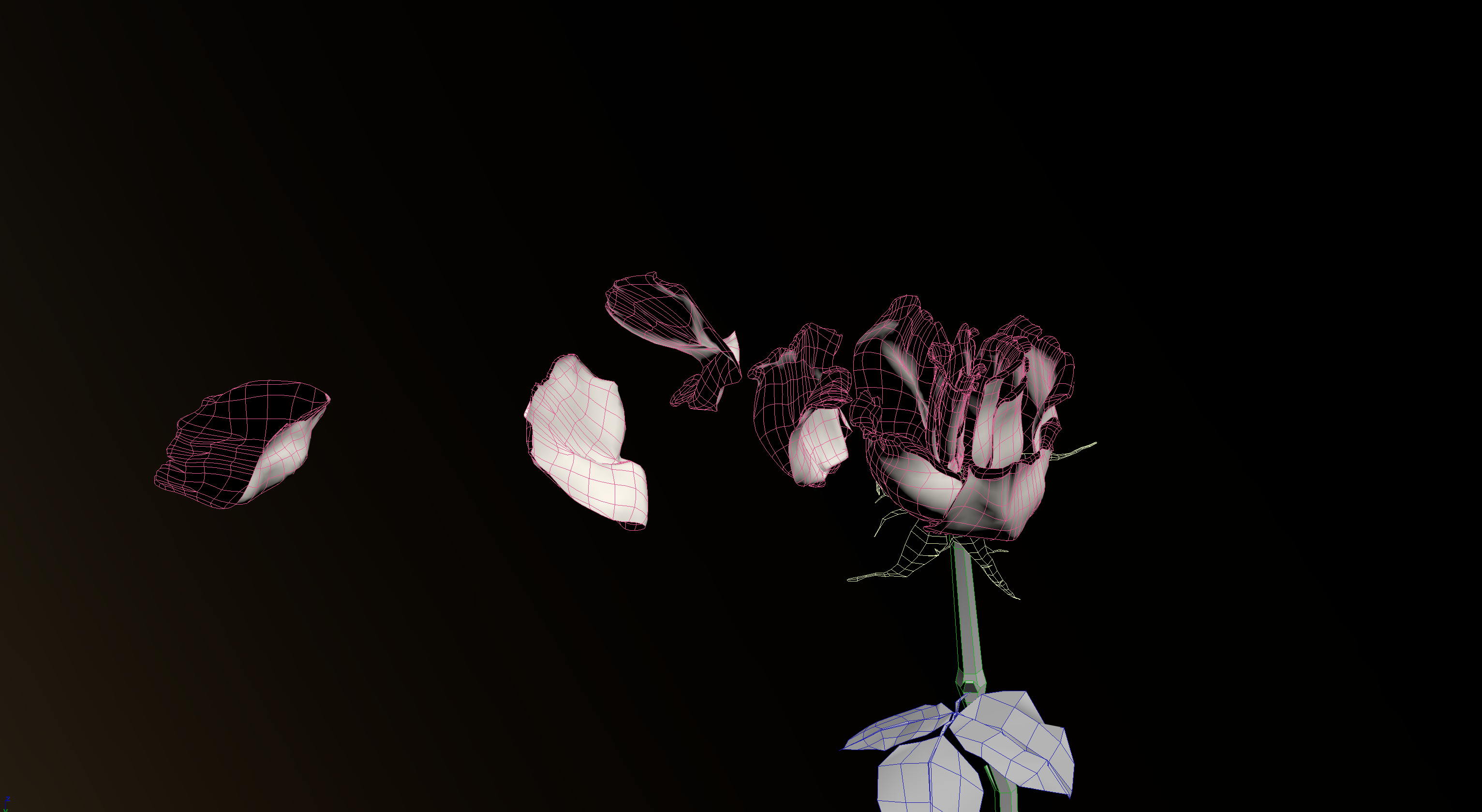 움직임을 표현하기 위해, 예를 들어 "오른쪽에서 바람이 불고 있다"고 가정하면 바람은 장미의 부드러운 바깥 꽃잎에서 한 장씩 날아갑니다. 1장 1장의 거리를 조정하는 것으로, 무너져 풀려 흩어지도록 날아 간다……라고 하는 인상을 줄 수 있습니다. 회전시키는데도, 단지 회전할 뿐만 아니라 「연속의 흐름」을 의식하면 좋습니다.