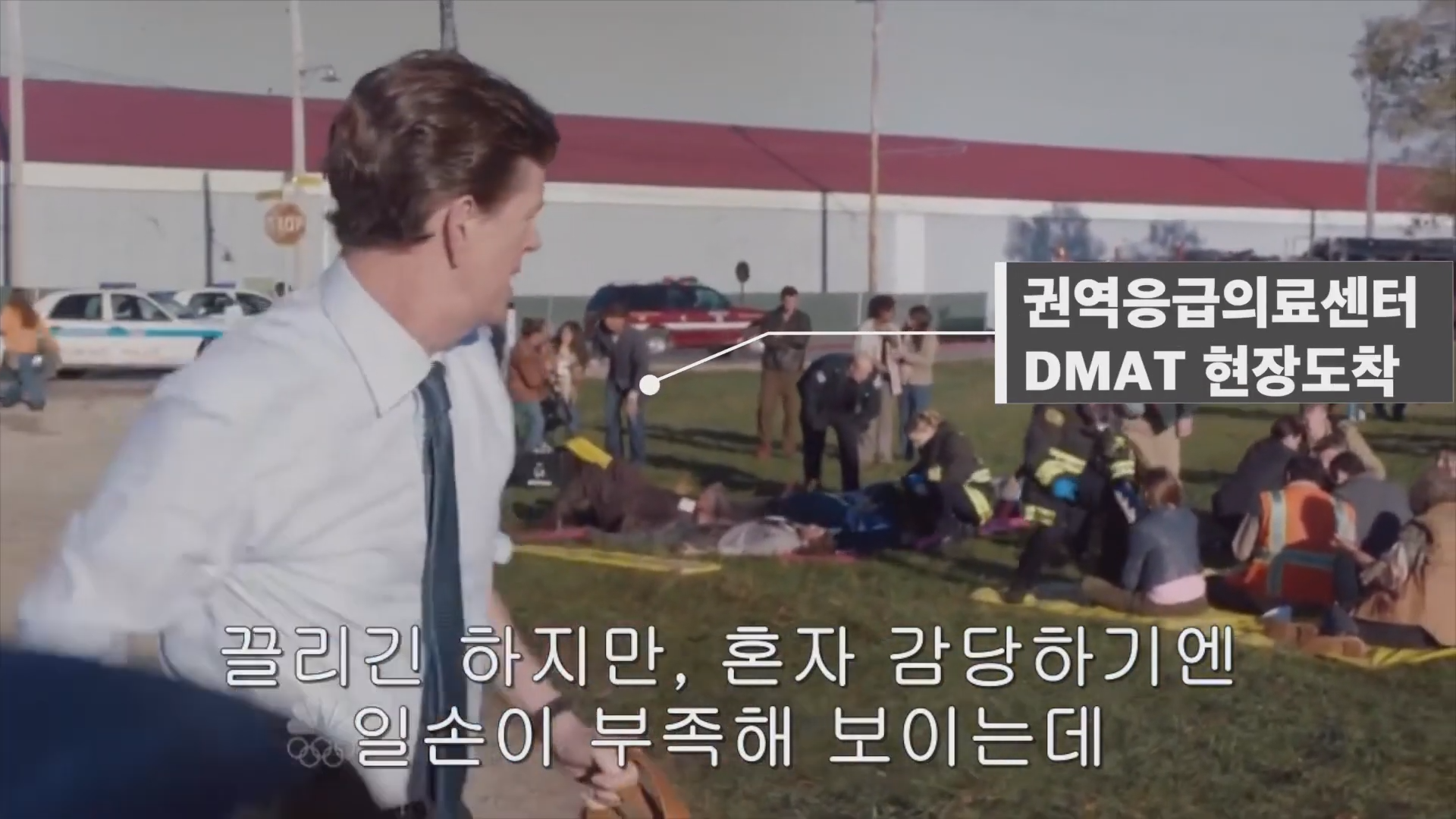소방대원이 재난의료지원팀(DMAT)을 요청한다.
