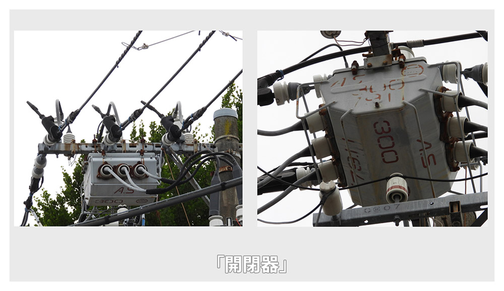 전선은 상하로 몇 층으로 나누어져 있습니다. 맨 위가 "고압선" (6,600V)이고 그 아래가 "저압 동력선" (200V)으로 되어 있습니다.