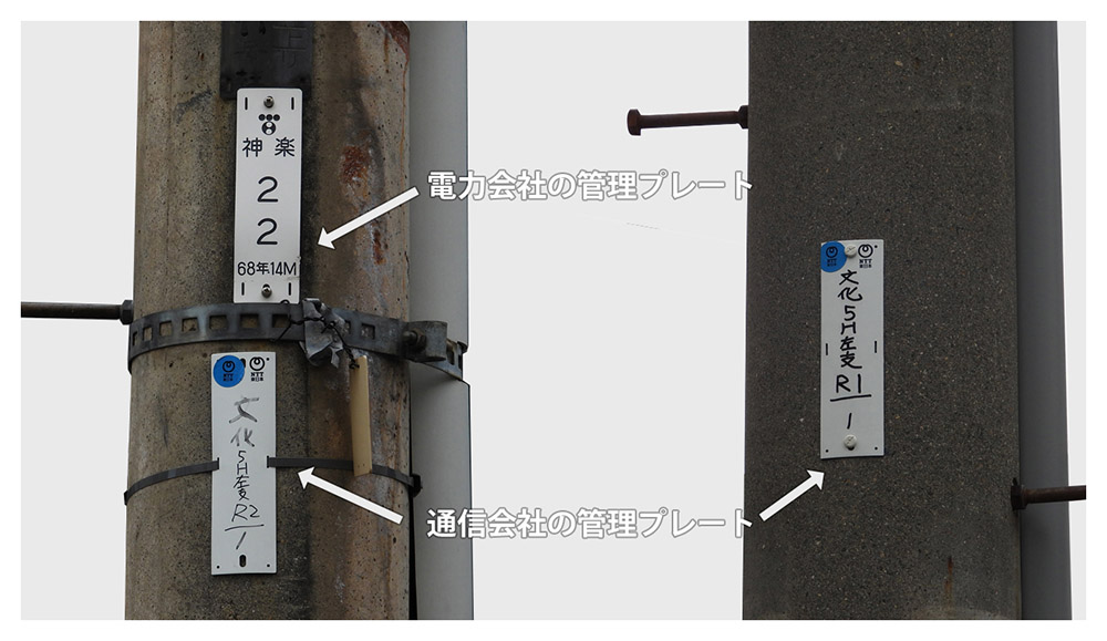 전력회사와 통신회사가 공용으로 관리하고 있는 전주도 있어, 이것을 「공용기둥」 이라고 부릅니다. 이 경우 두 관리 시트가 모두 설치됩니다.