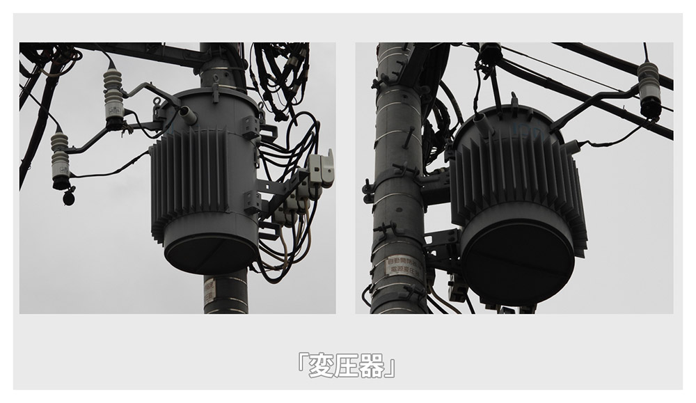 거기에서 전신주에 설치되어 있는 「변압기」로 100V나 200V로 전압을 낮춘 후 각 가정에 전달됩니다.