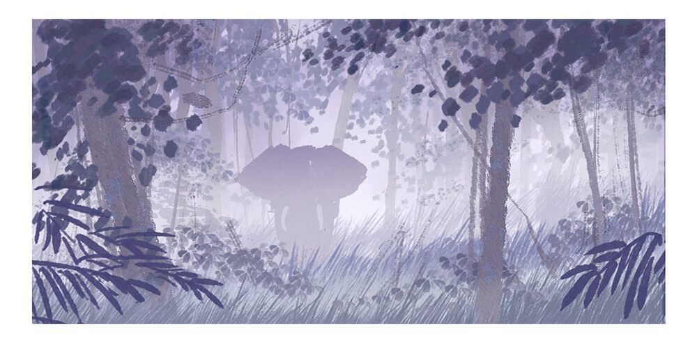 ▲필자의 오리지날 작품. Focal Point의 코끼리를 안개로 숨기고, 실루엣만을 보여주는 것으로, 신비한 분위기를 표현하고 있습니다. 이와 같이 안개나 모야를 사용하면 보여주고 싶지 않은 것을 숨길 수 있습니다. 덧붙여 이 작례에서는 멀리에 위치하는 것 만큼 명도를 높게 하는 것으로, 화면을 심플한 레이어에 정리해, 원근감을 내고 있습니다