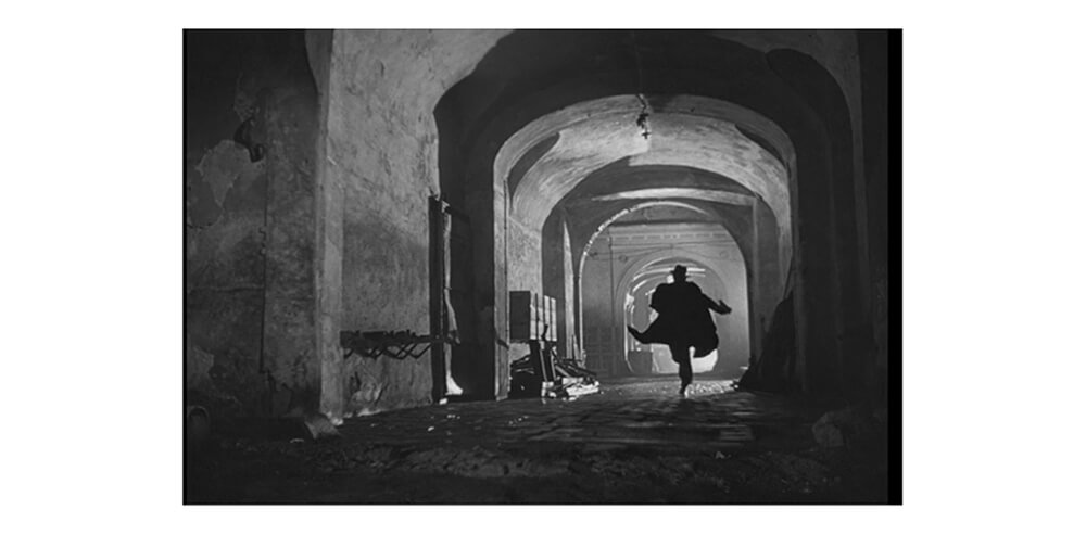 ▲『The Third Man(방제: 제3의 남자)』(1949)(캐롤 리드(Carol Reed) 감독) 안의 샷. 도망치는 남자의 실루엣이 역광에 의해 강조되고, 얼굴이나 디테일이 숨겨지는 것으로, 화면을 보는 사람에게 「누구일까?」라는 흥미를 가져다주는 효과가 있습니다