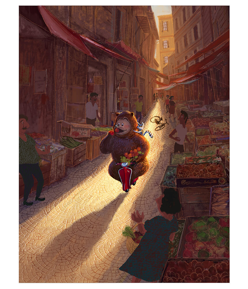 ▲『마다가스카르3』(2012)를 위해 필자가 그린 비주얼. 골목에 쏟아지는 석양이, Focal Point가 되는 캐릭터의 윤곽선을 두드러지게 해, 로맨틱한 분위기를 표현하고 있습니다. 일몰에 의한 역광은 화면 전체를 따뜻한 분위기로 만드는 효과도 있습니다.