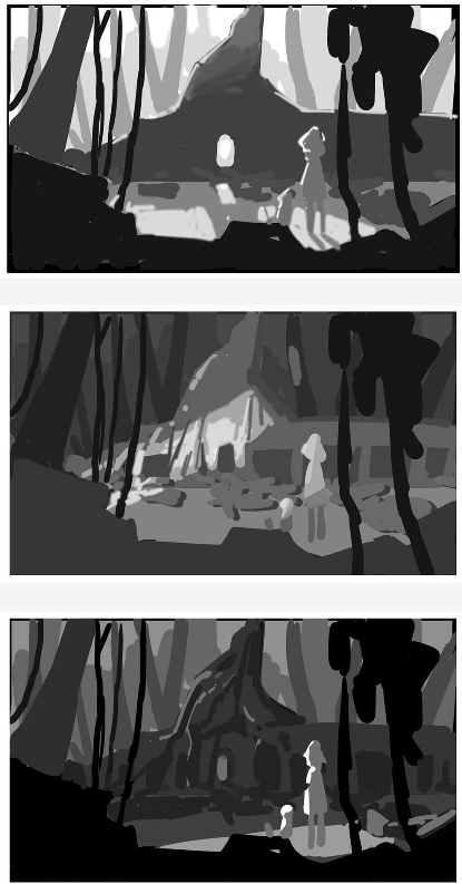 ▲ 썸네일을 그릴 때는 선화의 세세한 디테일에 얽매이지 않고, 화면 요소를 5~6개의 단순하고 거친 명암의 덩어리로 파악해, 리더빌리티에 주의하면서 디자인하는 것이 중요합니다. 다양한 아이디어를 사용하여 최적의 조명을 찾아보세요.