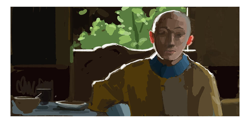 ▲『The Last Emperor』안의 샷을 필자가 인용 목적으로 모사한 것입니다. 인물의 후방에 있는 창으로부터의 빛(림 라이트)이, 의자와 인물의 윤곽선을 깨끗이 돋보이게 하고 있습니다. 또한 화면 오른쪽에서 두 번째 라이트가 인물의 얼굴을 비추고 화면의 리더빌리티를 높입니다.