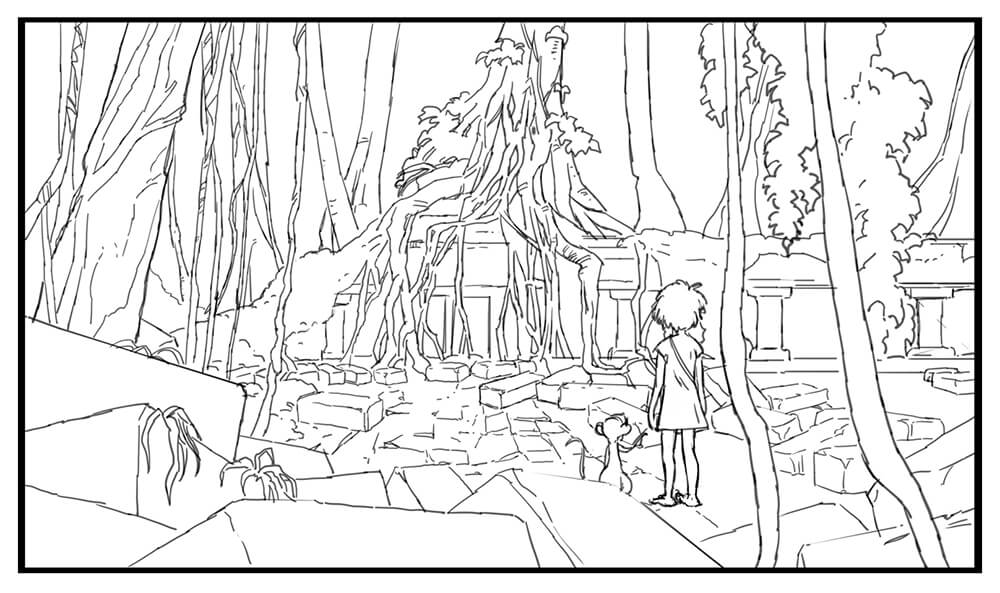 ▲ 썸네일을 그릴 때는 선화의 세세한 디테일에 얽매이지 않고, 화면 요소를 5~6개의 단순하고 거친 명암의 덩어리로 파악해, 리더빌리티에 주의하면서 디자인하는 것이 중요합니다. 다양한 아이디어를 사용하여 최적의 조명을 찾아보세요.