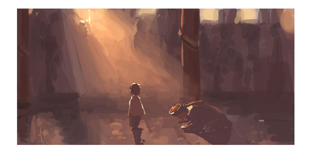 ▲『마다가스카르3』(2012)를 위해 필자가 그린 비주얼. 골목에 쏟아지는 석양이, Focal Point가 되는 캐릭터의 윤곽선을 두드러지게 해, 로맨틱한 분위기를 표현하고 있습니다. 일몰에 의한 역광은 화면 전체를 따뜻한 분위기로 만드는 효과도 있습니다.