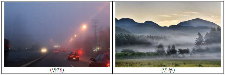 (연무) 안개의 일종. 안개는 넓은 지역 자체를 의미하고, 연무는 비슷하지만 부분 부분 생기는 구름 정도로 보면 될 듯 하다. |