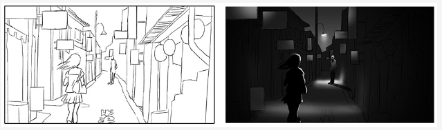 ▲ 'Shadowking'을 위해 필자가 그린 비주얼 개발. 향해 우측의 2명을 쫓는 인물의 캐스트 그림자를 그리는 것으로, 「공포」 「위압감」등의 감정이나 분위기를 표현하고 있습니다