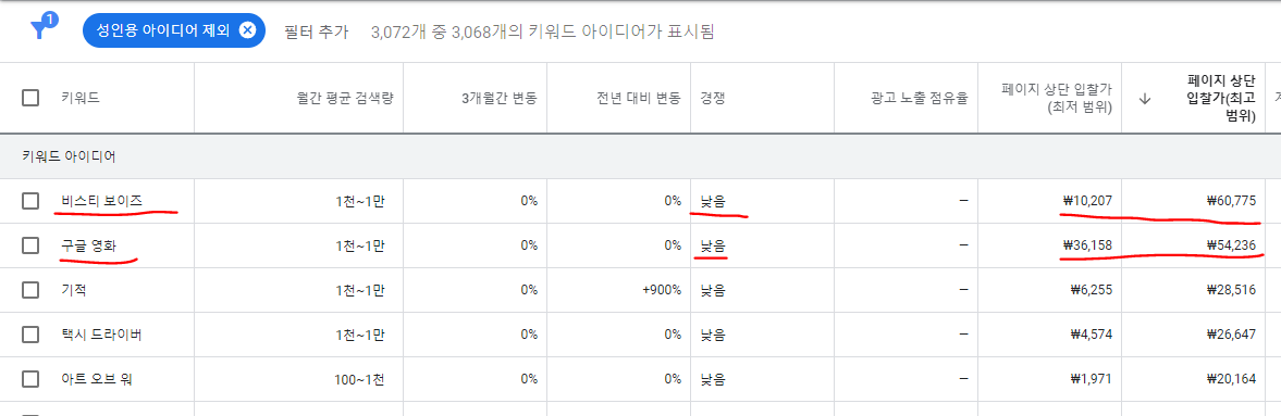 일단 테스트 기준 ’구글영화 , 비스티 보이즈‘ 키워드의 단가가 높은 거 같다.