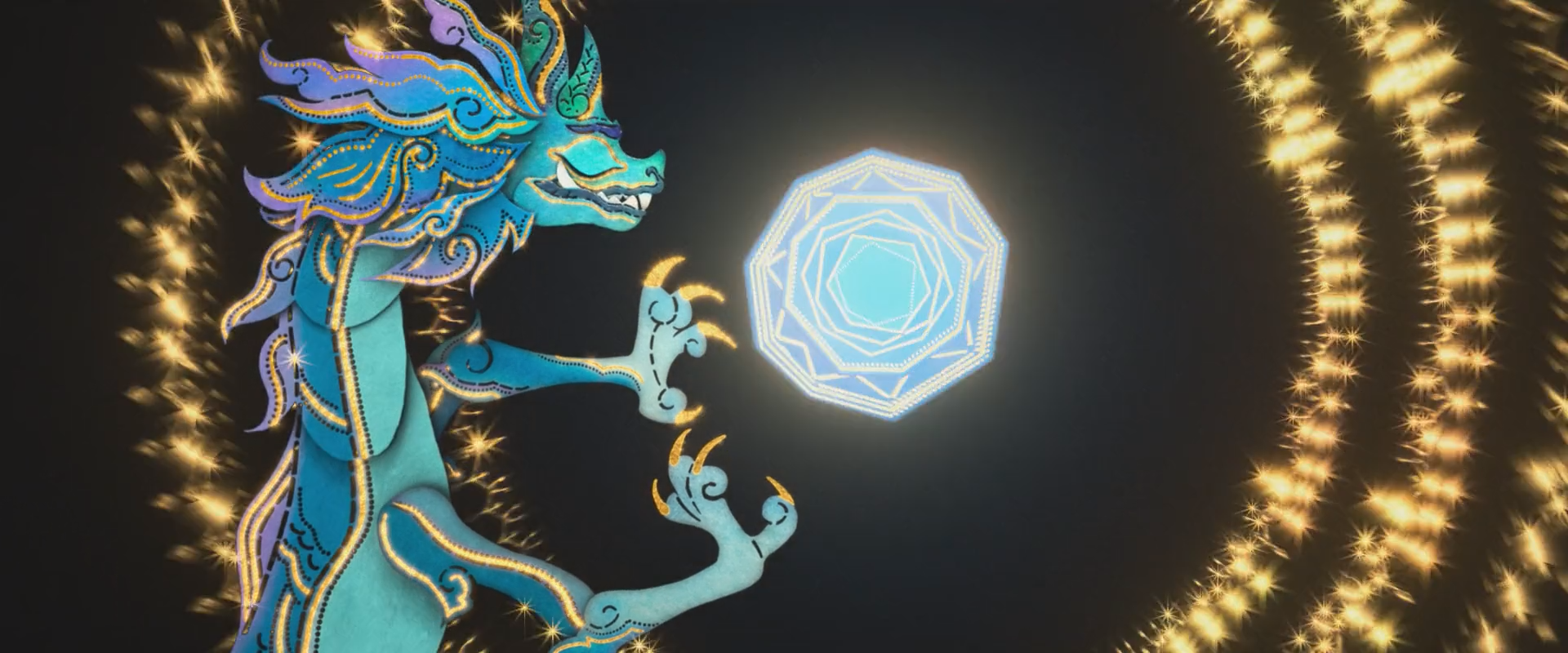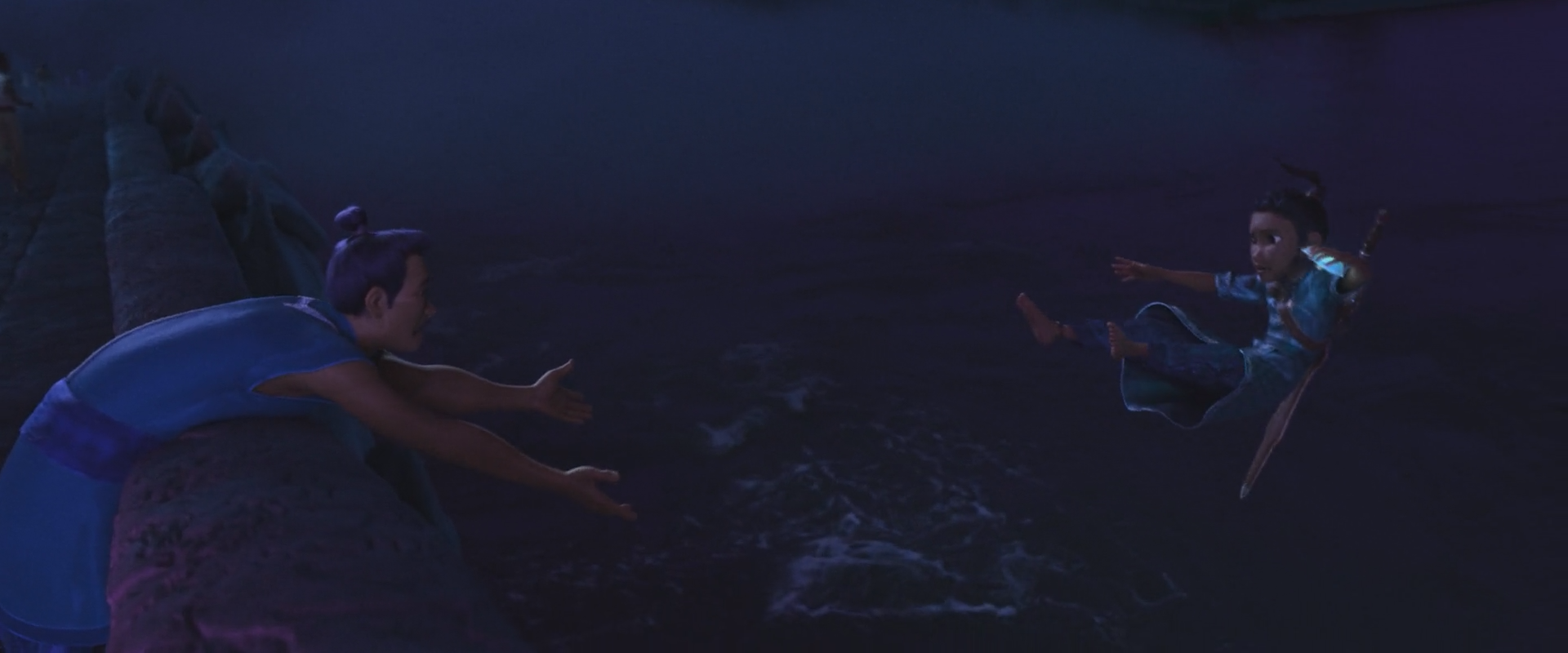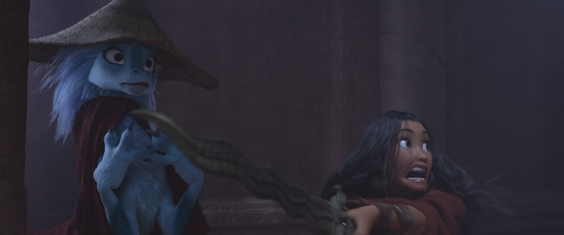 용의 모습으로 라야를 도와주는 장면에서도, 라야는 용을 못보게 가로 막으며 난리를 친다.