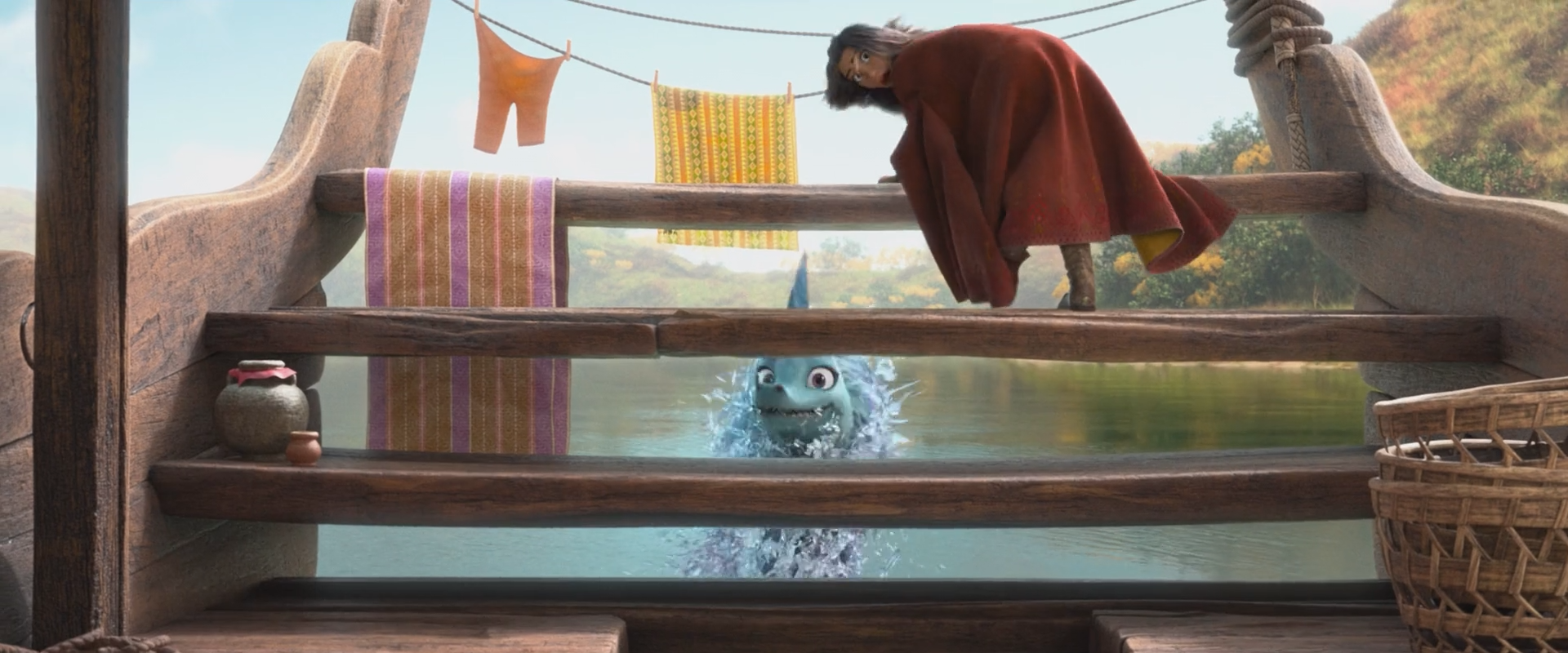 용의 모습으로 라야를 도와주는 장면에서도, 라야는 용을 못보게 가로 막으며 난리를 친다.