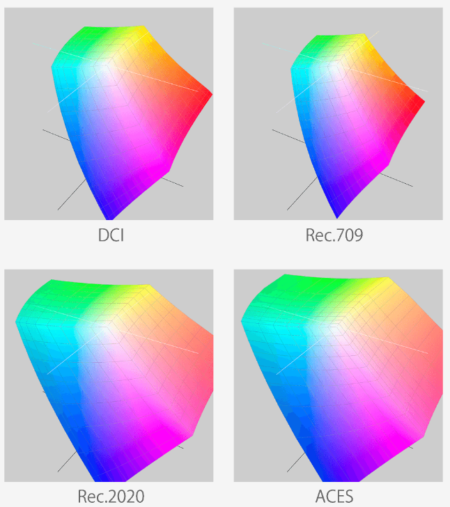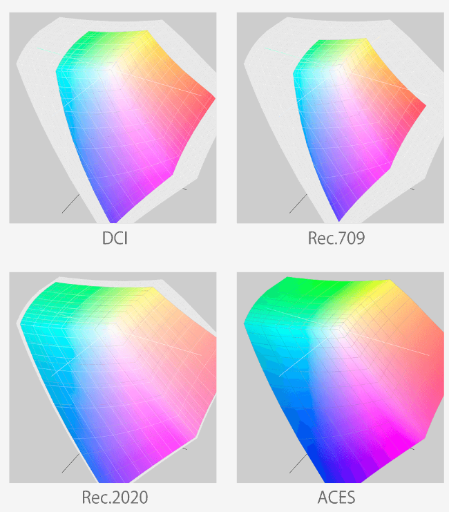 얇은 그레이 부분이 ACES로, 색이 붙은 곳이 비교 대상의 칼라 스페이스입니다.