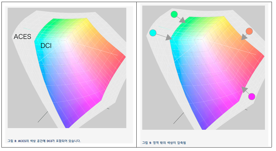 ACES를 기준으로 대표적인 색상 공간을 비교한 것이다.