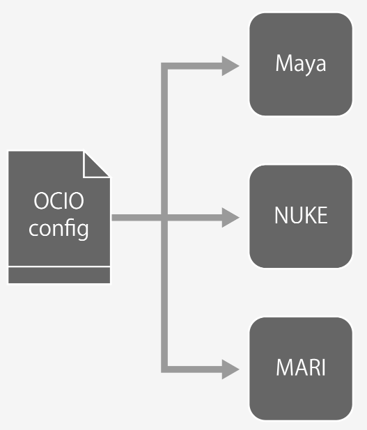 미리 설정에 필요한 정보가 기술된 「설정 파일(OCIO config)」 을 사용해 여러 프로그램간 컬러 공간을 쉽게 공유 합니다.