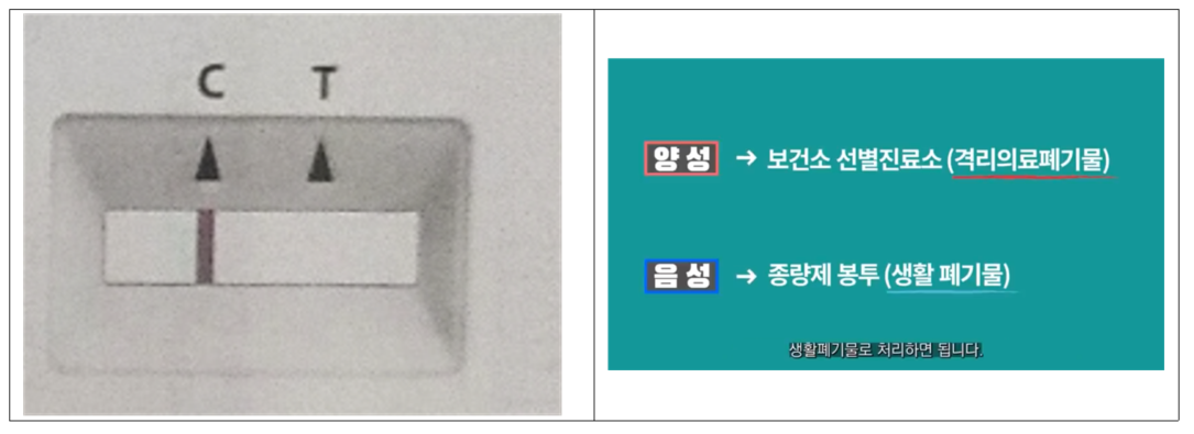 | 한줄 = 음성 ‘C‘ | 두줄 = 양성 | 두줄 희미함 = 양성 | 아무 줄 없으면 = 무효 한줄 = 무효 ‘T’ |