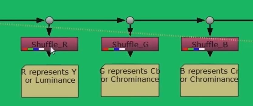 nuke를 통해 YCbCr 채널을 각각 분리하고, (Green / Blue) 채널에 blur를 적용하면, 이미지 압축으로 거칠게 생성된 픽셀을 부드럽게 처리할 수 있다.