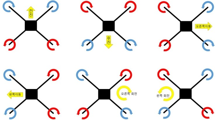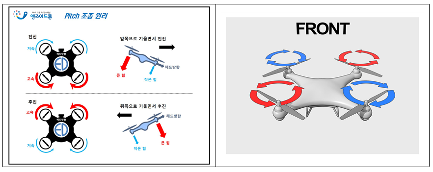 전 2장의 회전 속도를 늦게, 뒤 2장의 회전 속도를 빨리 하면 드론은 앞으로 진행된다는 것입니다!