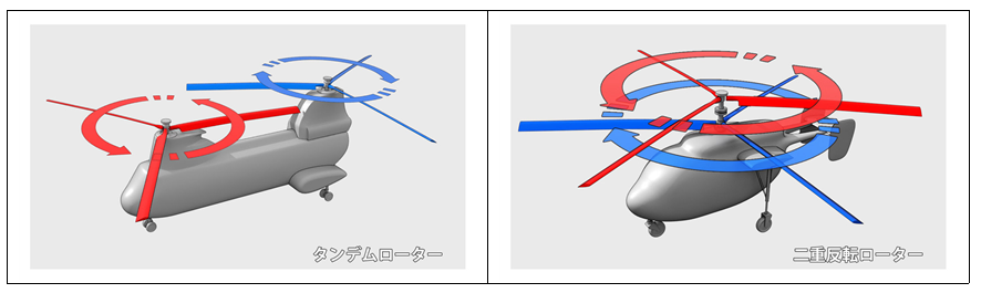 세로로 로터를 2개 동축상에 배치하고, 그들을 역회전시킴으로써 반토크를 상쇄합니다.