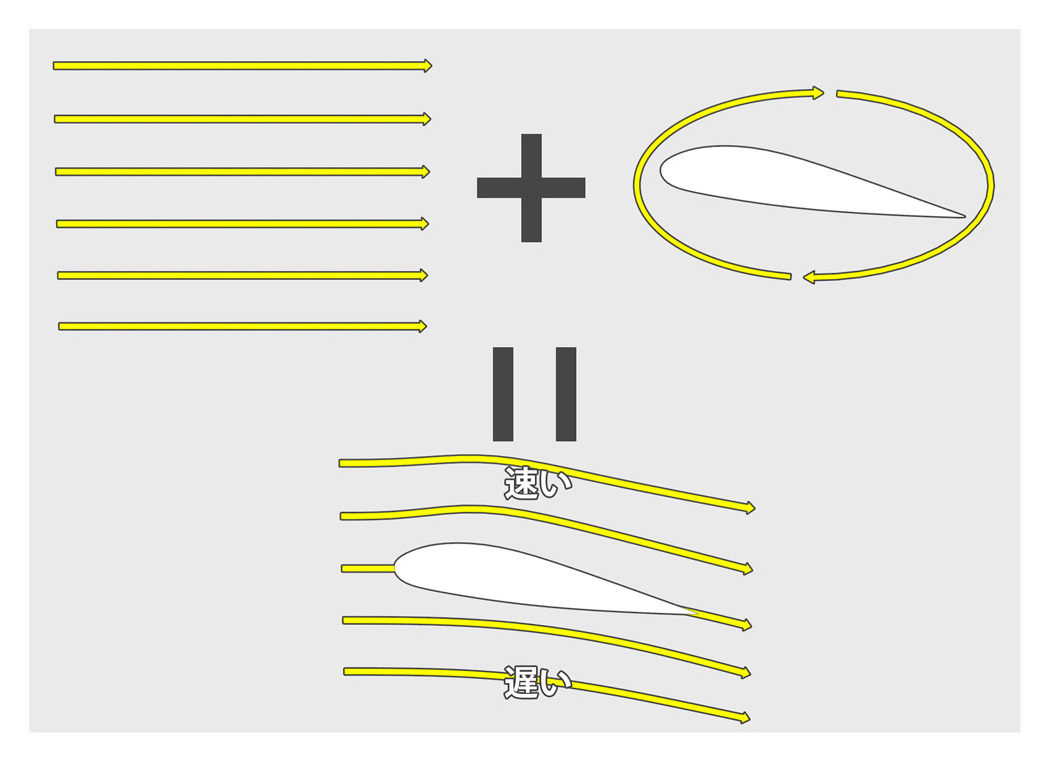 앞으로 진행하는 비행기의 날개 주위에는 시계 방향의 소용돌이가 발생합니다. 그러면 날개의 상면에서는 기류가 빨라지고, 밑면에서는 느려집니다. 상면의 기압이 내려 양력이 태어나 날개는 위로 끌어올려진다는 것입니다.