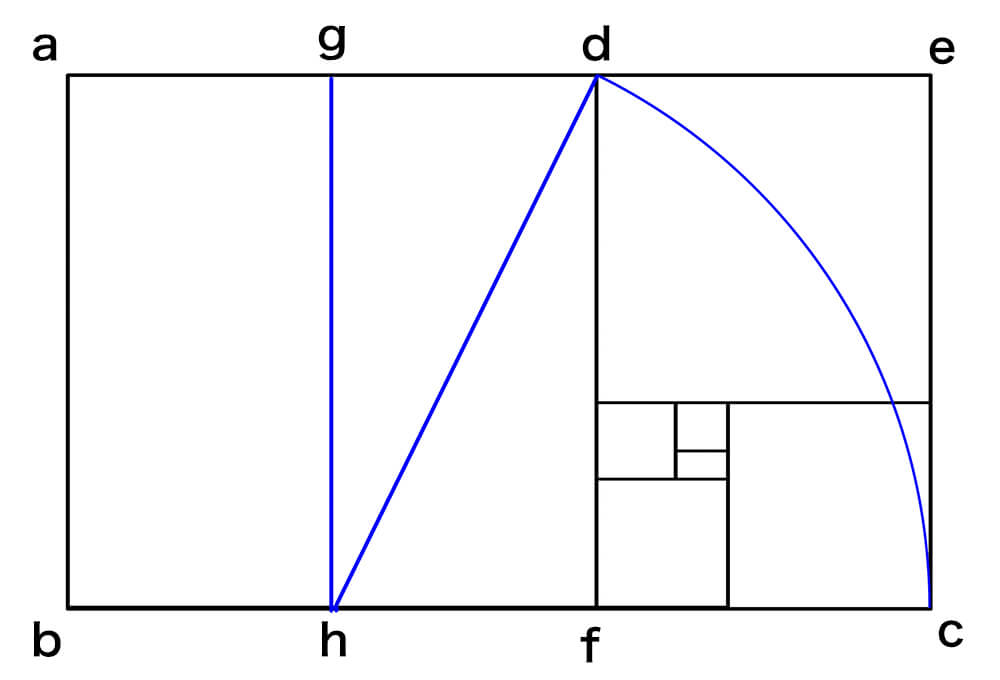 ▲ 위 그림의 직사각형은 단변 (ab) : 장변 (bc) = 1 : 1.618 의 황금 직사각형입니다. 이 황금 직사각형에서 단변을 한 변으로 하는 정사각형(abfd)을 제거하면 남은 직사각형(dfce)도 황금 직사각형이 됩니다. 그리고, 단변 (ed) : 장변 (da) = 1 : 1.618 입니다. 이것을 반복하면, 황금 직사각형의 내부는 정사각형으로 채워져 갑니다. 앞의 변과 같이, 단변 (fg) : 장변 (gd) = 짧은 변 (gh) : 장변 (hi) = 짧은 변 (hj) : 장변 (jk) = 1 : 1.618 입니다. 일련의 정사각형의 한 변을 반경으로 하는 원호를 순서대로 그려가면, 황금비의 나선을 그릴 수 있습니다