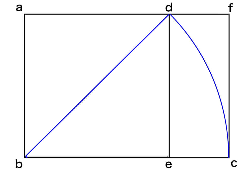 ▲위 그림을 사용하여 황금 직사각형 그리는 법을 설명합시다. 연장선의 교점을 점(c) 으로 한다.