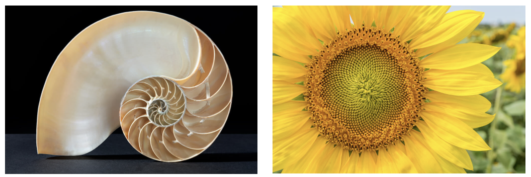 ▲【왼쪽】 앵무새 가이 안에는 황금비의 나선이 있습니다/【오른쪽】 해바라기의 중심부에도 황금비의 나선이 있습니다
