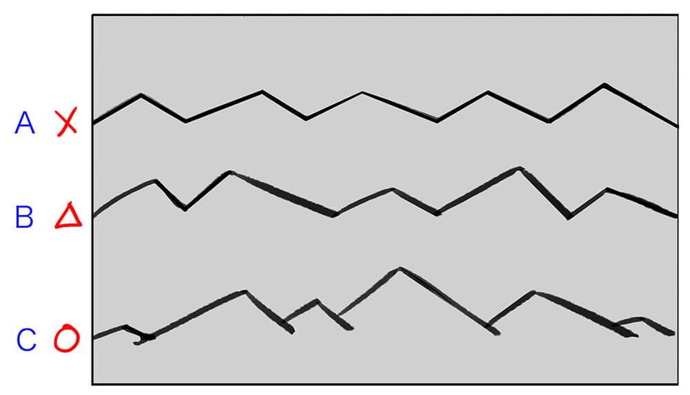 ▲【A】선을 평행하게 나란히 그리면, 평범한 인상의 그림이 됩니다.