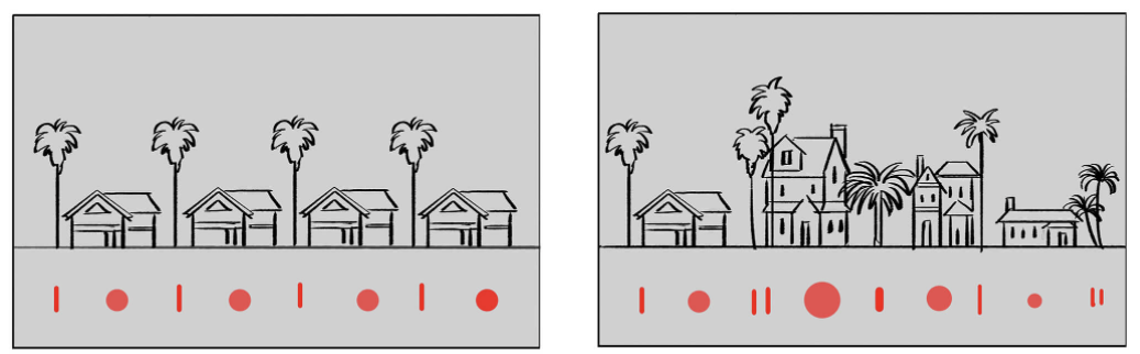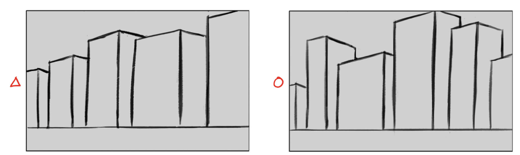 ▲【왼쪽】빌딩의 높이, 사이즈, 모양이 비슷하면, 획일적이고 평범한 느낌의 화가 됩니다.