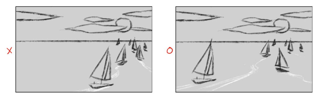 다만 그림 안에 어떠한 오브젝트를 레이아웃 할 때에는 의도적인 표현이 아닌 한 동형의 반복은 피하도록 합시다.