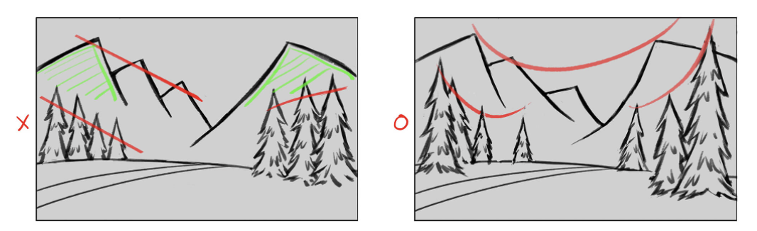 나무나 산등의 같은 오브젝트를 반복 배치하는 경우라도, 높이, 사이즈, 형태, 각도 등을 바꾸면 재미있는 그림이 됩니다.