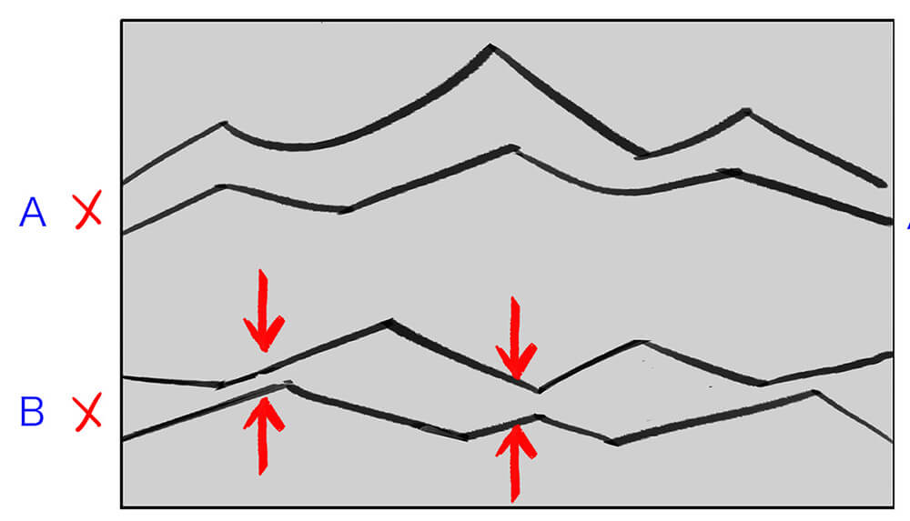 【B】선끼리가 너무 가까우면, 핀치 포인트(Pinch Point)가 태어나, 흐름이 멈추고 비좁은 인상의 그림이 됩니다.