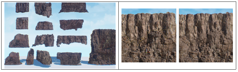절벽의 물체는 Megascans 기반으로 가공하여 원경과 근경용으로 나누어 만들었다.
