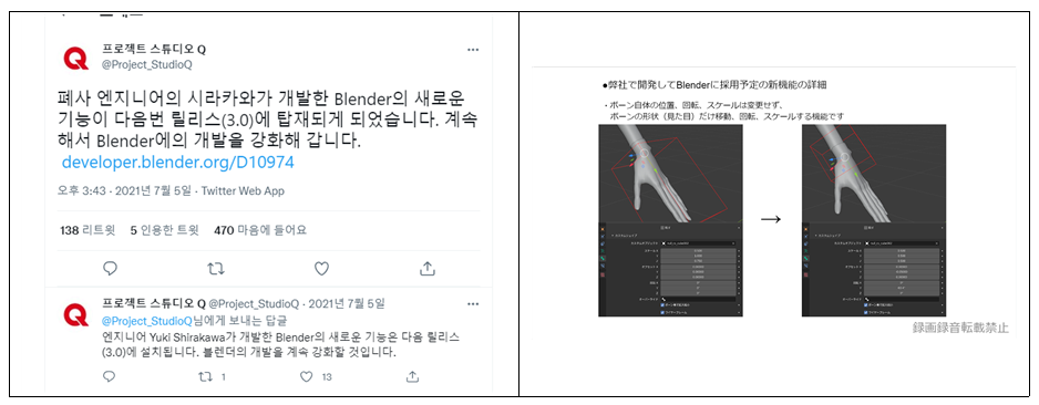 Blender는 'Blender Chat'이라는 채팅 기능이 있어 전 세계 사용자와 개발자와 영어로 교환할 수 있다. 이번 새로운 기능의 구현은 스튜디오 Q가 채팅을 통해 블렌더 측에 타진한 것으로 실현되었다.