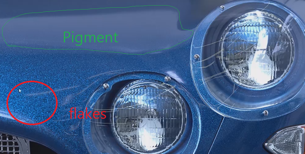 flakes 는 자동차 재질에는 노이즈 느낌의 미세한 페인트들이 칠해지는데, 마치 그레인처럼 보인다. 이런 부분을 말한다. 근접샷에선 이런 미세한 노이즈 부분이 재질의 디테일이 된다. 하지만, 랜더링 시간이 굉장히 오래 걸리고, 잘못 랜더 하면 그레인이 심하게 낀 것처럼 보인다.