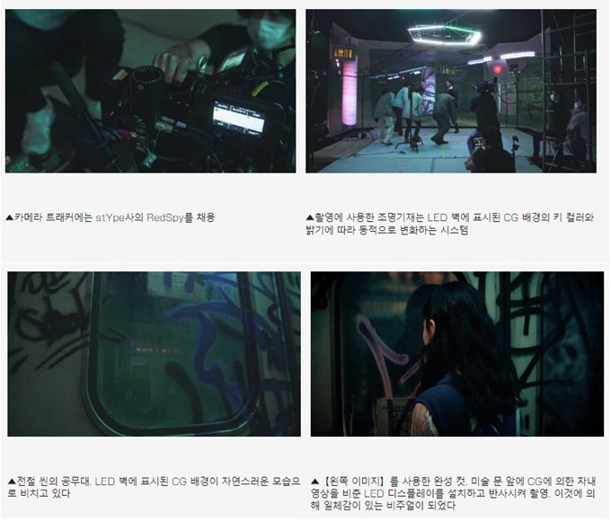크로마 촬영에서는 키잉이 어려운 철망의 미술을 이용한 컷이나, LED 월에 비추는 CG 씬의 전환을 굳이 원컷으로 파악한 것을 들 수 있다.