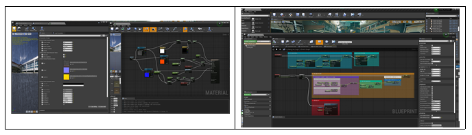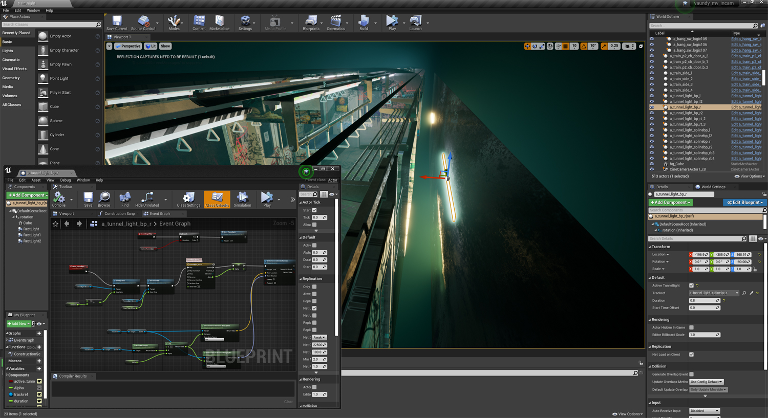 ▲ 차량 밖, 터널을 달리는 동적인 라이트 컨트롤에도 Blueprint를 활용. 동적 조명으로 인해 좀더 높은 성능의 장비가 필요했다.