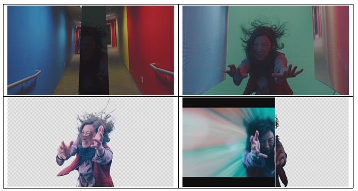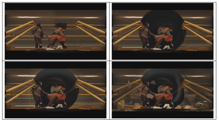 | 인물을 크로마 앞에서 촬영 바람에 영향을 받아 휘날리는 사물들 회전하는 느낌을 추가하기위해 중간중간 뒤틀림을 그려줌 |