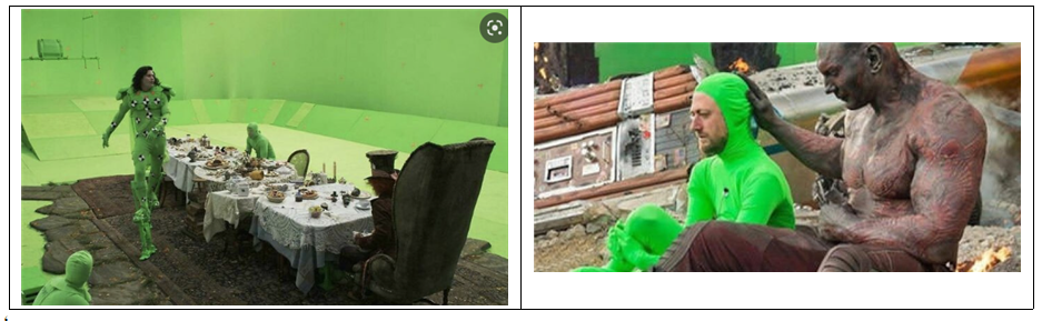 cg작업을 하기 앞서, (블루& 그린맨)이 대역으로 연기를 하는 경우가 있다.